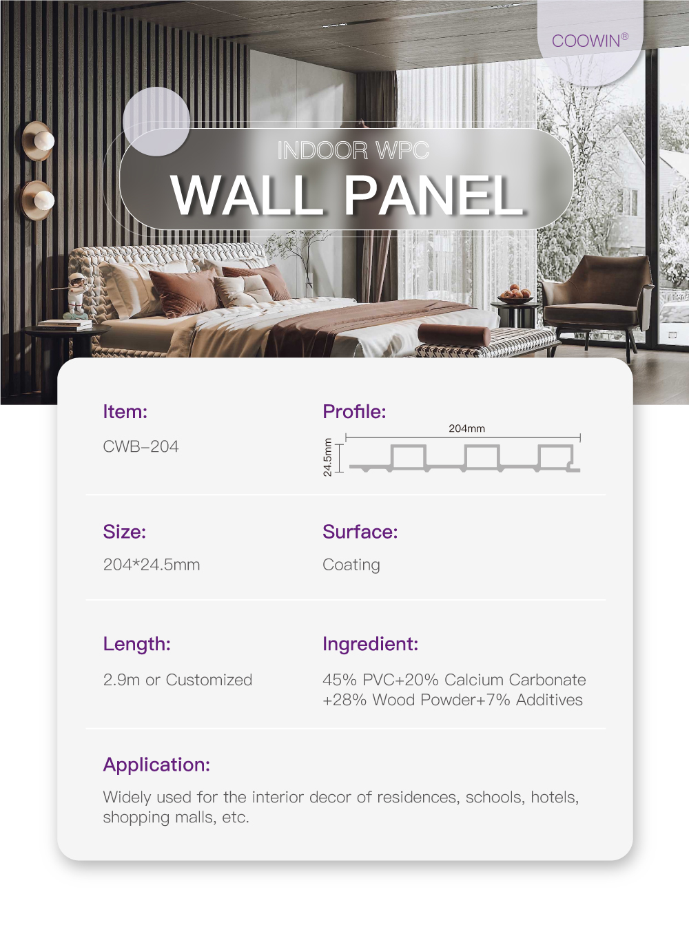 COOWIN® is an indoor WPC decoration material manufacturer that provides high-quality WPC wall panels, ceilings, timber tubes, etc. Our WPC wall panel product has a variety of designs and good price, suitable for bathroom, house decoration.
